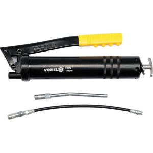 Шприц мастильний VOREL — це надійний інструмент для майстерень і промислових умов. Оснащений алюмінієвим корпусом і місткістю бака 400 мл, він підходить для використання з картриджами по 400 г або об'ємним мастилом. Здатний витримувати тиск від 41 до 69 МПа, цей шприц ідеально підходить для обслуговування промислової техніки, будівельної техніки, автомобілів, фургонів, вантажівок та сільськогосподарського обладнання. Змінні наконечники (жорсткий і гнучкий) забезпечують зручність у використанні, а ПВХ ручка забезпечує комфорт під час роботи.