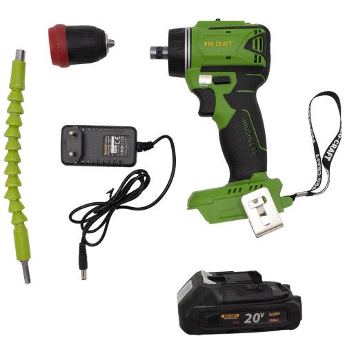 Для додаткового комфорту та стабільності інструмент оснащений ергономічною додатковою ручкою, а вбудоване LED-підсвічування забезпечує якісне освітлення робочої зони навіть у слабоосвітлених місцях. Шуруповерт поставляється у зручному пластиковому кейсі разом із надійним акумулятором на 20 В 2 А·г, зарядним пристроєм та гнучким валом, що розширює можливості інструмента.