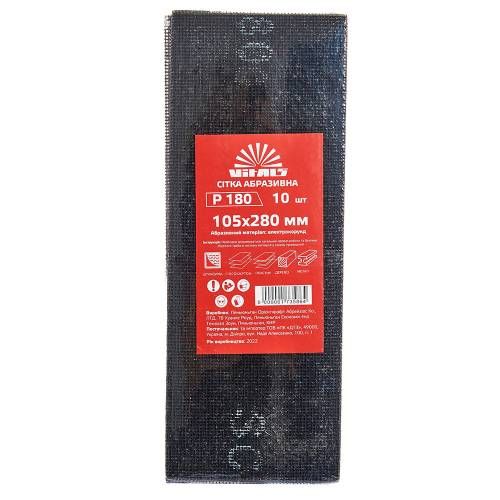 Сітка абразивна Vitals 105х280 мм з. 180 також має інші унікальні властивості, такі як зерно P180, розміри 105х280 мм та кількість в упаковці - 10 штук.