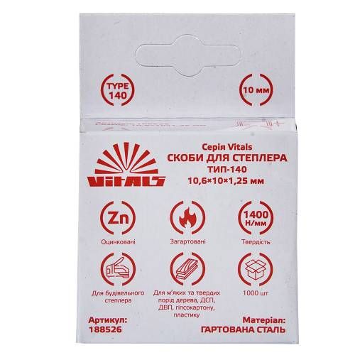 Основні переваги скоб тип-140 10 1,2 мм 1000 шт. Vitals: висока міцність та надійність, тривалий термін служби, широкий спектр застосування, легка установка, відмінна якість матеріалів.