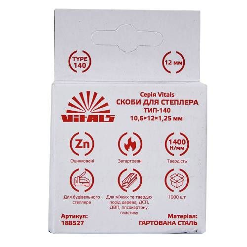 Скоби для степлера тип-140 12 1,2 мм в упаковці по 1000 штук виготовлені з гартованої сталі, що оцинкована. Ці скоби призначені для будівельних степлерів. Висота скоби (цвяха) становить 12 мм.Вони мають ширину 10,6 мм і рекомендовані для використання зі степлерами типу 140. Крім того, кожна упаковка містить 1000 скоб.Ці скоби ідеально підходять для використання в будівельних роботах і забезпечують надійне і міцне скріплення.Їх можна використовувати для кріплення будівельних матеріалів, таких як деревина, пластик, тканина та інші.Гартована сталь забезпечує довговічність і міцність цих скоб, що дозволяє їм ефективно виконувати свої функції протягом тривалого періоду часу.Оцинковане покриття захищає скоби від корозії і забезпечує надійну захист від зовнішніх факторів.Крім того, ці скоби легко і точно встають відповідно до вимог вашого степлера, що забезпечує ефективність роботи і зручність використання.Замовляйте скоби для степлера тип-140 12 1,2 мм в упаковці по 1000 штук Vitals і отримуйте якісні та надійні скоби, які стануть незамінним помічником у будівельних роботах.