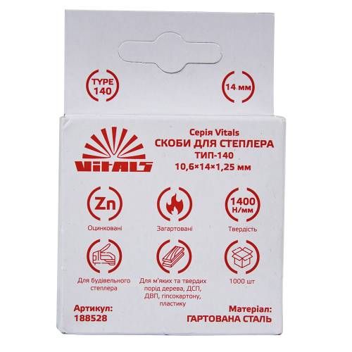 Товар Скоби для степлера тип-140 14x1,2 мм 1000 шт. Vitals є незамінним аксесуаром для будівельного степлера. Виготовлені з гартованої сталі і оцинковані для забезпечення максимальної міцності і довговічності. Ширина скоби становить 10,6 мм, а висота - 12 мм. Упаковка містить 1000 штук скоб. Ці скоби відмінно підходять для робіт у будівельній галузі, де необхідно з'єднувати матеріали шляхом степлування. Вони надійно і безпечно закріплюють дві поверхні одна до одної і забезпечують міцне з'єднання. Такі скоби є важливим інструментом для будівельних робіт і забезпечують швидке і ефективне степлування матеріалів.