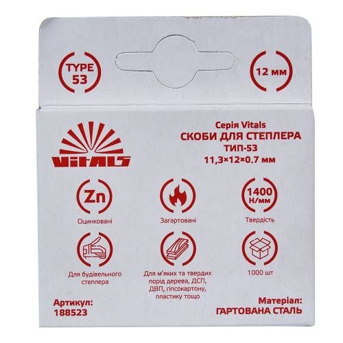 Скоби для степлера тип-53 12 0,7 мм 1000 шт. Vitals - це високоякісні скоби від відомого виробника. Ширина скоби складає 11,3 мм, вона виготовлена з гартованої сталі, оцинкована для більшої захисту від корозії. Ці скоби призначені спеціально для будівельного степлера типу 53. Упаковка містить 1000 штук скоб, що забезпечує довгий період використання. Висота скоби (цвяха) - 12 мм. Завдяки своїм особливостям, ці скоби ефективні та надійні у використанні.