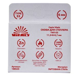 Скоби для степлера тип-53 6 0,7 мм 1000 шт. Vitals також відмінно підходять для робіт у сфері меблевого виробництва, упаковування, декорування та багатьох інших проектів.