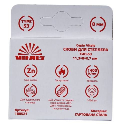 Скоби для степлера тип-53 8 0,7 мм 1000 шт. Vitals - це високоякісні скоби для будівельних степлерів. Вони виготовлені з гартованої сталі, що оцинкована для забезпечення довговічності і захисту від корозії. Ширина скоби складає 11,3 мм, а її висота - 8 мм. Це стандартний розмір скоби тип-53, який підходить для багатьох різних видів степлерів. Упаковка містить 1000 скоб, що забезпечує достатню кількість для використання в будівельних роботах, офісі або вдома. Використовуйте ці скоби для закріплення матеріалів разом зручно і надійно.