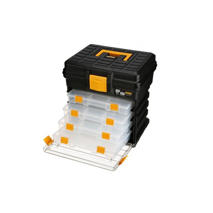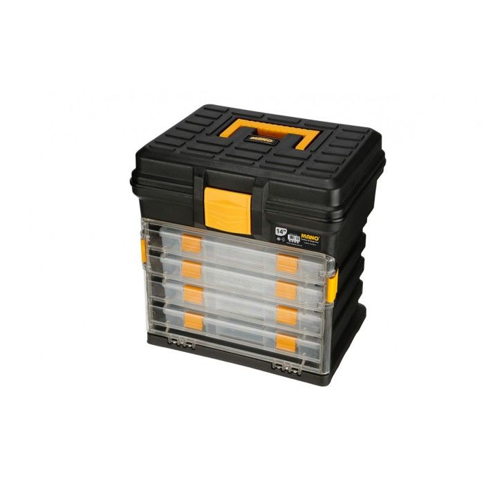 Скринька для інструментів MANO H-14 - ідеальний вибір для зберігання інструментів у порядку. Виготовлена з якісного матеріалу, вона має розмір 340x272x341 мм, що забезпечує достатньо місця для розміщення різних видів інструментів. Зручна ручка дозволяє легко переносити скриньку, а міцні зажими забезпечують надійне закриття. Модель оснащена висувним секціями для зручного розміщення інструментів. Ця скринька є надійним і практичним рішенням для будь-якого майстра або любителя ремонту.
