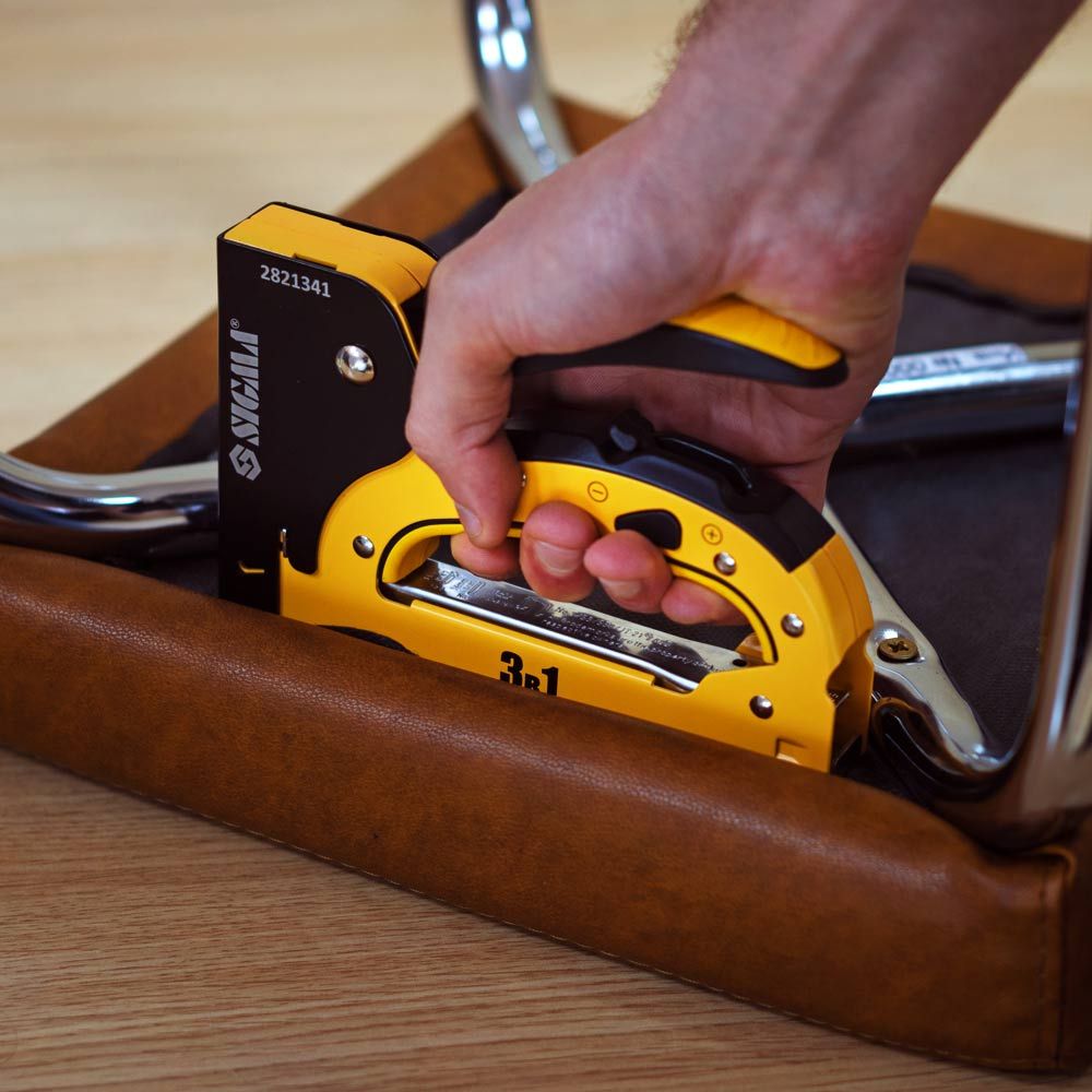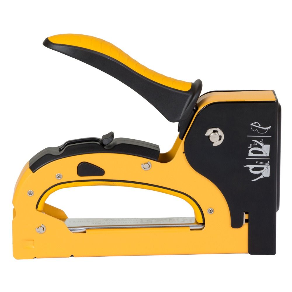 Незамінний при складанні меблів, укладанні килимового покриття, а також при фіксації утеплювача, обшивці м'яких меблів, багетних роботах. Універсальний інструмент, придатний для роботи зі скобами (6-14 мм), шпильками (14 мм) і цвяхами (14 мм). Повністю металева конструкція степлера з регулятором сили удару і гумова накладка на ручці сприяє зручній роботі зі степлером і тривалого терміну служби (не менше 100 000 ударів).