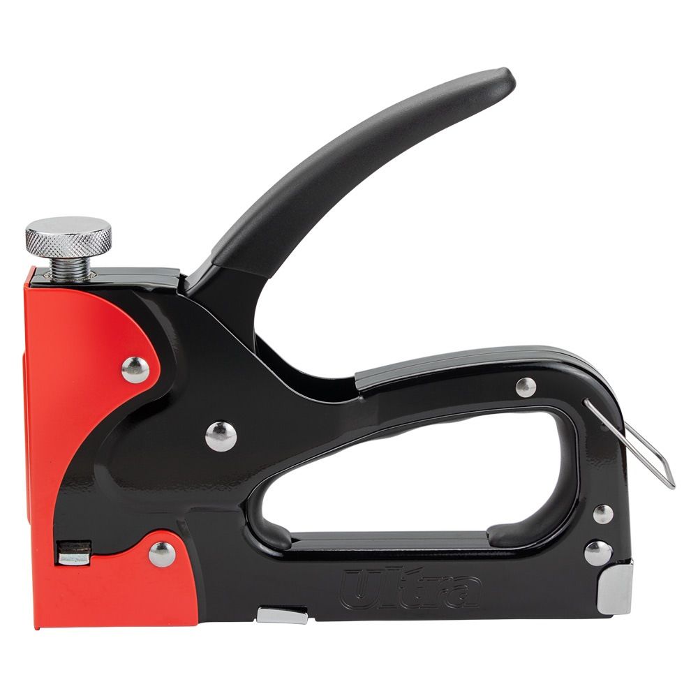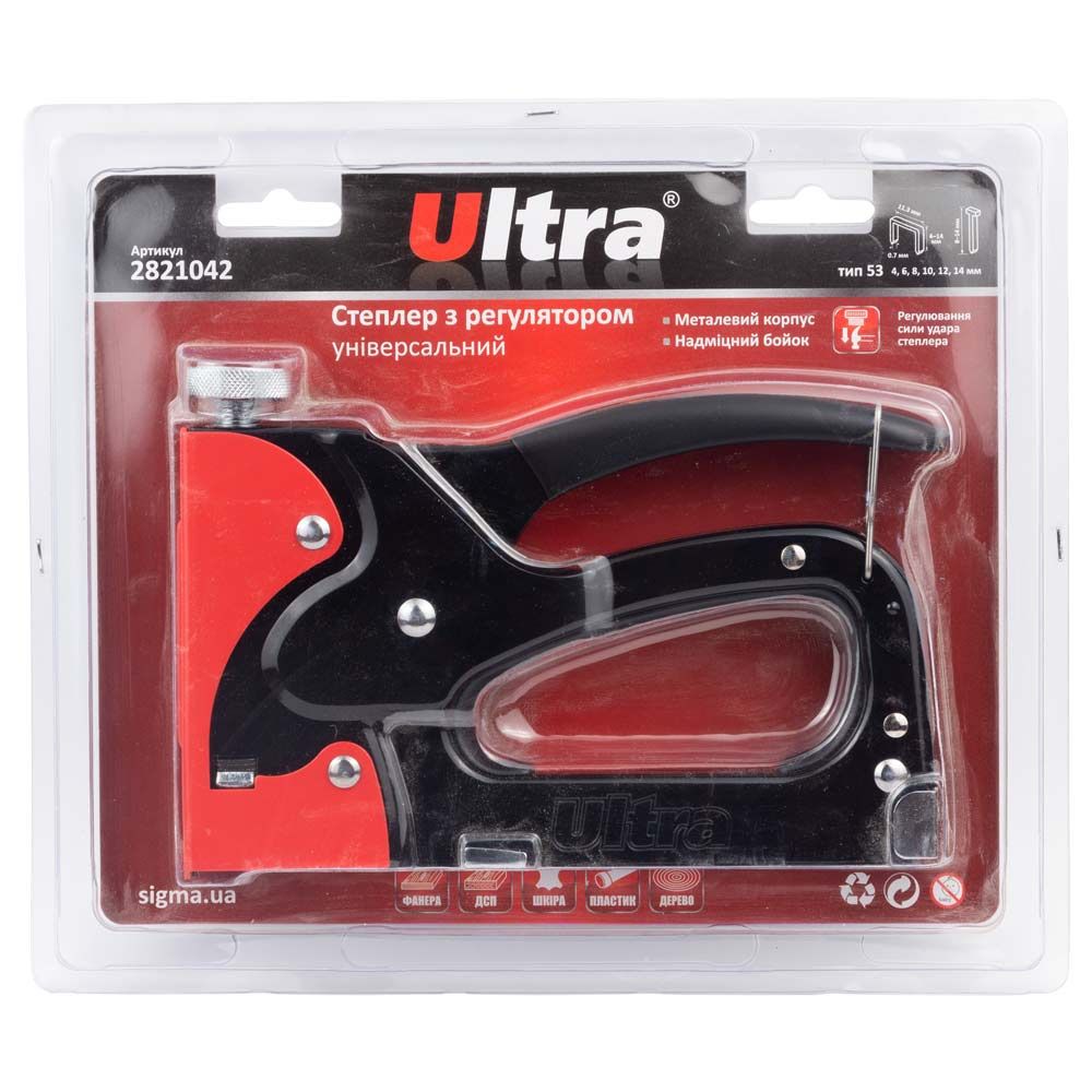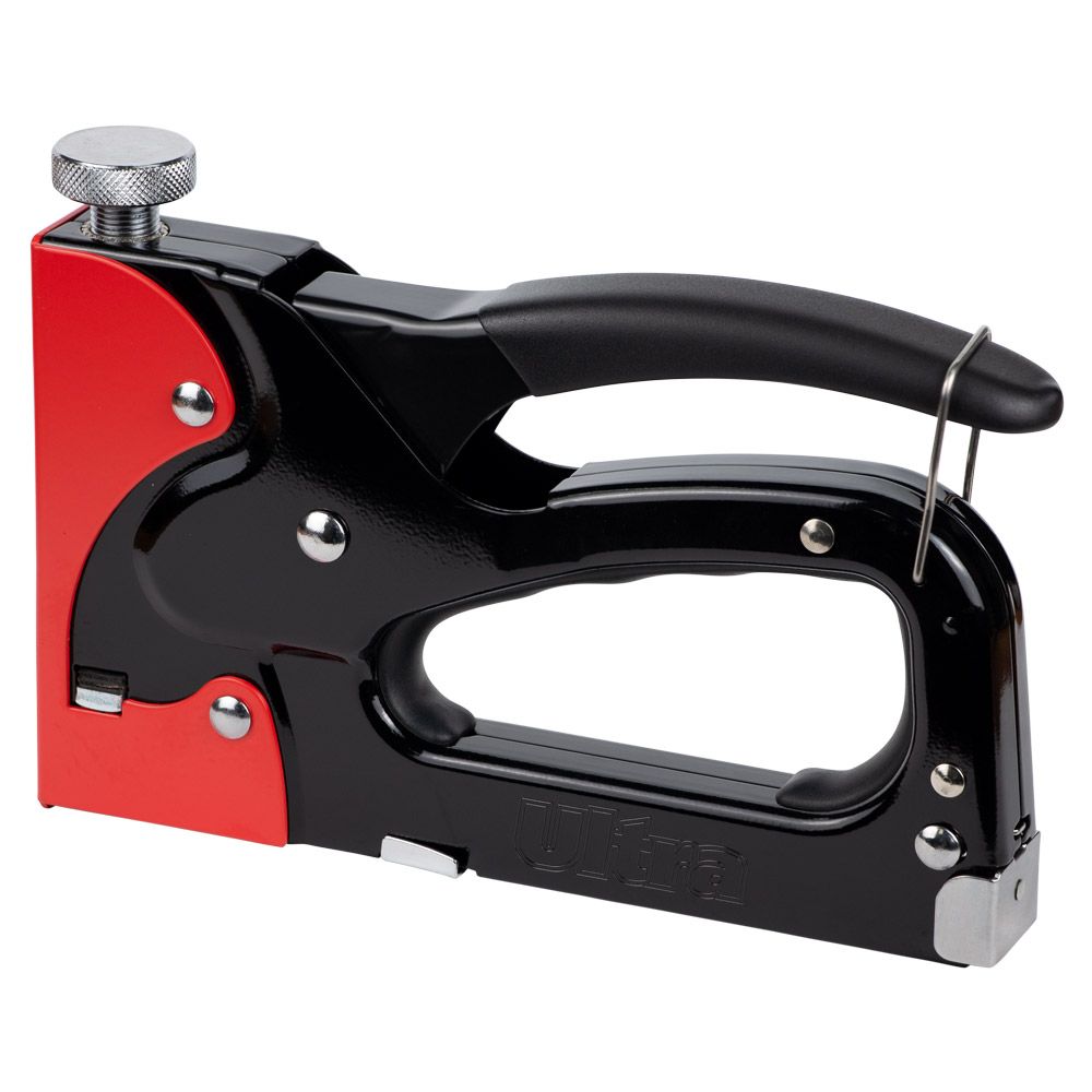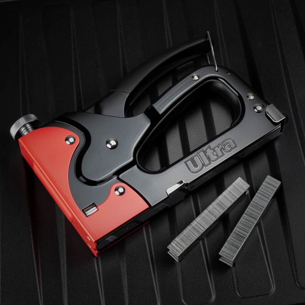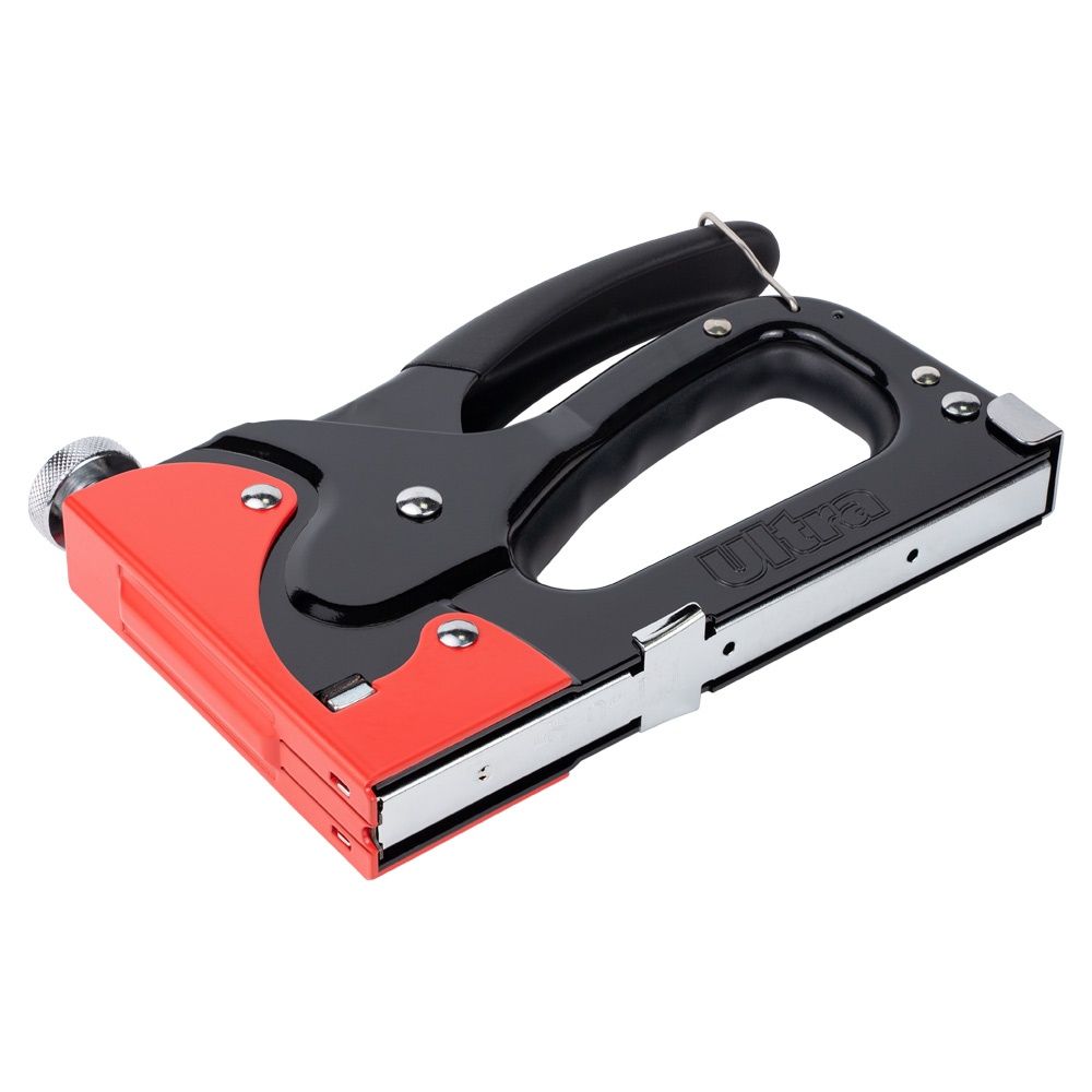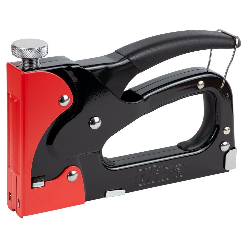 Універсальний степлер ULTRA 2821042 класу «Профі» із регулятором сили удару та надміцним бойком призначений для швидкого кріплення тонких матеріалів до деревини чи ДСП. Використовується для оббивки меблів, декорування, прокладання кабелю та оздоблювальних робіт.