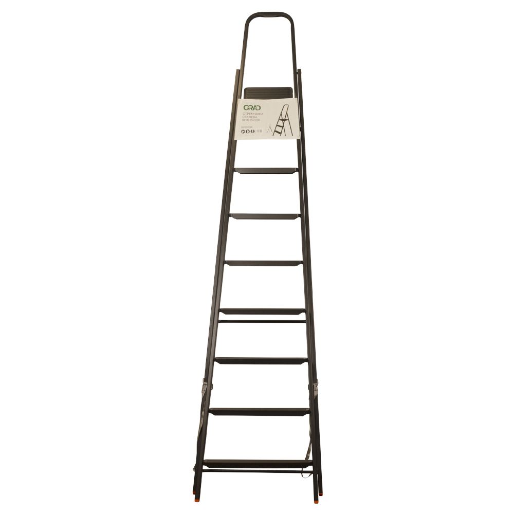 Стрем'янка сталева GRAD 8 сходинок 2,55 м (5035905) – зручна переносна драбина, що не потребує опори до стіни. Використовується для будівельних і ремонтних робіт усередині та зовні приміщень, а також у побуті чи для збирання врожаю в саду.