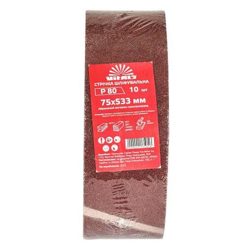 Основні переваги стрічки шліфувальної Vitals 75х533 мм з. 80:- Універсальність: підходить для шліфування різних матеріалів- Велика кількість в упаковці: 10 стрічок шліфувальних- Забезпечує якісне шліфування: розмір зерна P80- Компактний розмір: 75х533 мм- Довговічність і надійність- Зручна у використанні