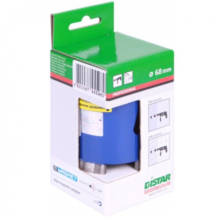 Діамантове корончате свердло Distar САСС-W призначене для свердління отворів у бетоні діаметром 68 мм і глибиною до 65 мм. Це свердло має 4 кріпильні отвори під різьбу М16 і підходить для використання з SDS+ перфораторами. Воно ідеально підходить для професійного використання при роботах на будівельних майданчиках та ремонтних роботах.