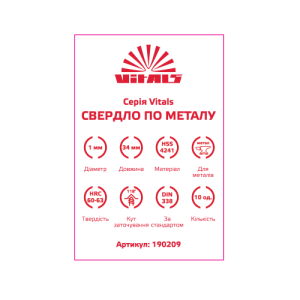 Свердло по металу HSS 1.0 (10 од.) Vitals є високоякісним і надійним інструментом для свердління отворів в металевих матеріалах. Воно виготовлено зі сталі HSS 4241, що забезпечує йому високу міцність і довговічність. Свердло відповідає стандарту DIN 338 і має загальну довжину 34 мм. Діаметр свердла складає 1.0 мм, що дозволяє зробити точні та чіткі отвори. Твердість ріжучого леза становить 60-63 HRC, що забезпечує йому високу стійкість до зношування і забезпечує чудову ріжучу якість.