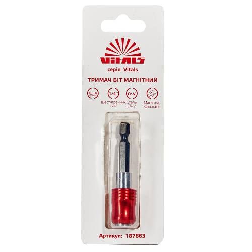 Тримач для біт магнітний 1/4"х65 мм, автофіксація Vitals - незамінний інструмент для проведення будь-яких ремонтних робіт. Виготовлений з високоякісної сталі Cr-V, довжиною 65 мм. Цей тримач забезпечує надійне утримання бітів завдяки магнітній основі, яка притягує їх і не дає випасти під час роботи. Автофіксація Vitals дозволяє фіксувати біти в тримачі, запобігаючи їх випаданню при використанні. Зручний і надійний інструмент, який допоможе вам швидко і якісно виконати ремонтні роботи в будь-яких умовах.