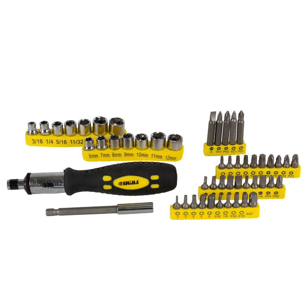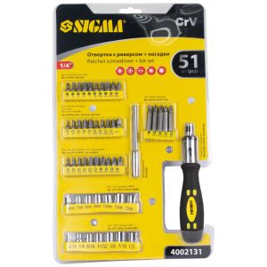 Викрутка з набором торцевих насадок і біт SIGMA (4002131) – універсальний комплект для побутових і професійних робіт. Набір із 51 предмета забезпечує широкий вибір інструментів для роботи з різьбовими з’єднаннями різних типів. Викрутка оснащена реверсом і зручною двокомпонентною ручкою, що забезпечує комфорт під час використання. Усі елементи виготовлені з міцної CrV сталі, яка гарантує надійність і довгий термін служби.