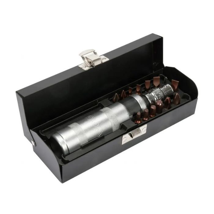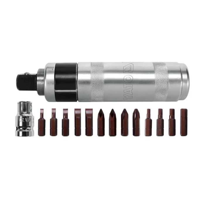 Викрутка ударна з магнітними насадками YATO YT-28015 призначена для затягування і послаблення болтів і гайок. Викрутка виготовлена з міцної хром-ванадієвої сталі (CrV 6150), стійка до деформації при ударі молотком, магнітні насадки зі сталі (S2). В комплекті зручний металевий кейс для зберігання.