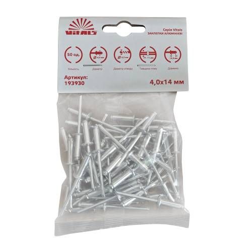 Це алюмінієві заклепки Vitals діаметром 4.0 мм та довжиною 14 мм. Вони мають велику міцність та стійкість до корозії. Ці заклепки використовуються для з'єднання різних матеріалів, таких як метал, пластик, дерево тощо. Вони легкі у використанні та мають надійну фіксацію. Заклепки алюмінієві 4.0x14 мм (50 од.) Vitals - це надійний вибір для будь-яких завдань, які вимагають міцного з'єднання. Будьте впевнені в якості та надійності з цими заклепками.