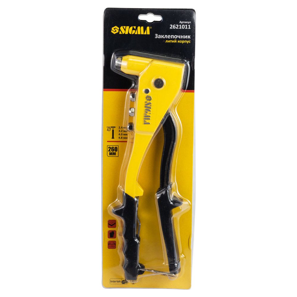 Заклепочник SIGMA 2621011 із литим корпусом довжиною 260 мм призначений для роботи з витяжними заклепками. Надійна конструкція забезпечує тривалий термін служби та зручність у використанні при монтажних і ремонтних роботах.