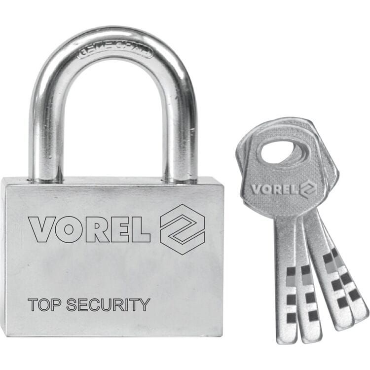 Основні переваги замку навісного VOREL чавунного l=40мм:- Надійність. Чавунний матеріал забезпечує довговічність і міцність замка.- Простота використання. Замок легко встановлюється і комфортно використовується.- Естетичний вигляд. Замок має привабливий зовнішній вигляд і довгий термін служби.- Універсальність. Замок може бути використаний в різних приміщеннях і забезпечує надійний захист майна.