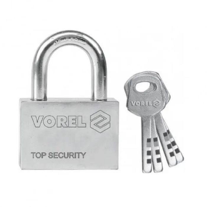 Головні переваги замка навісного VOREL чавунного l=60мм: висока міцність, довговічність, високий клас захисту (четвертий), зручне замикання зсередини, сучасний і стильний дизайн.