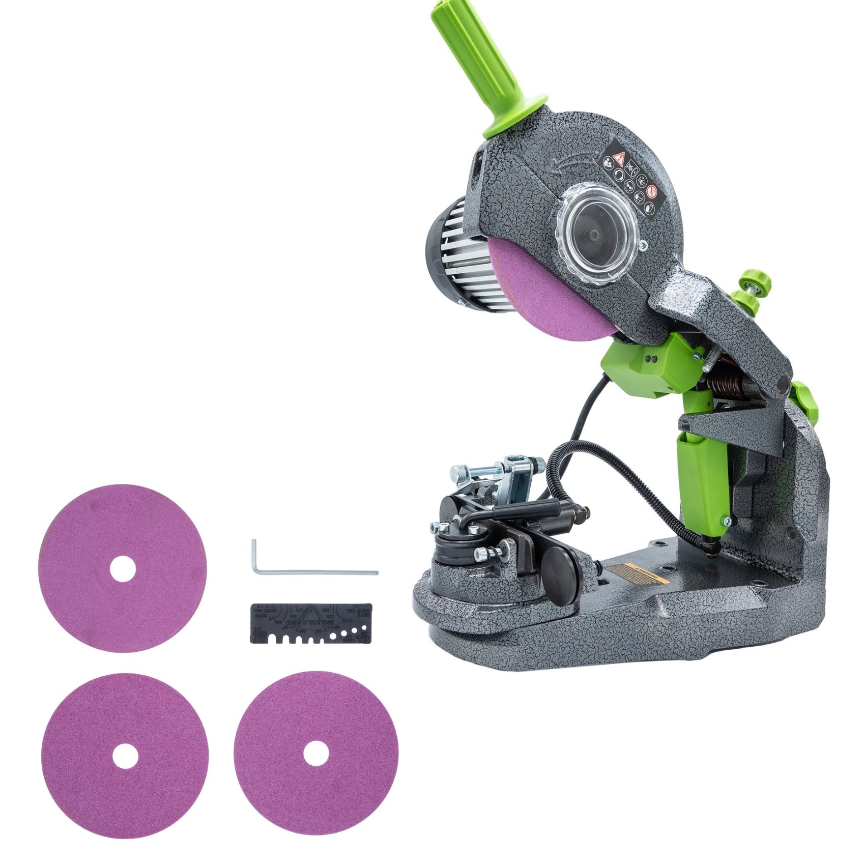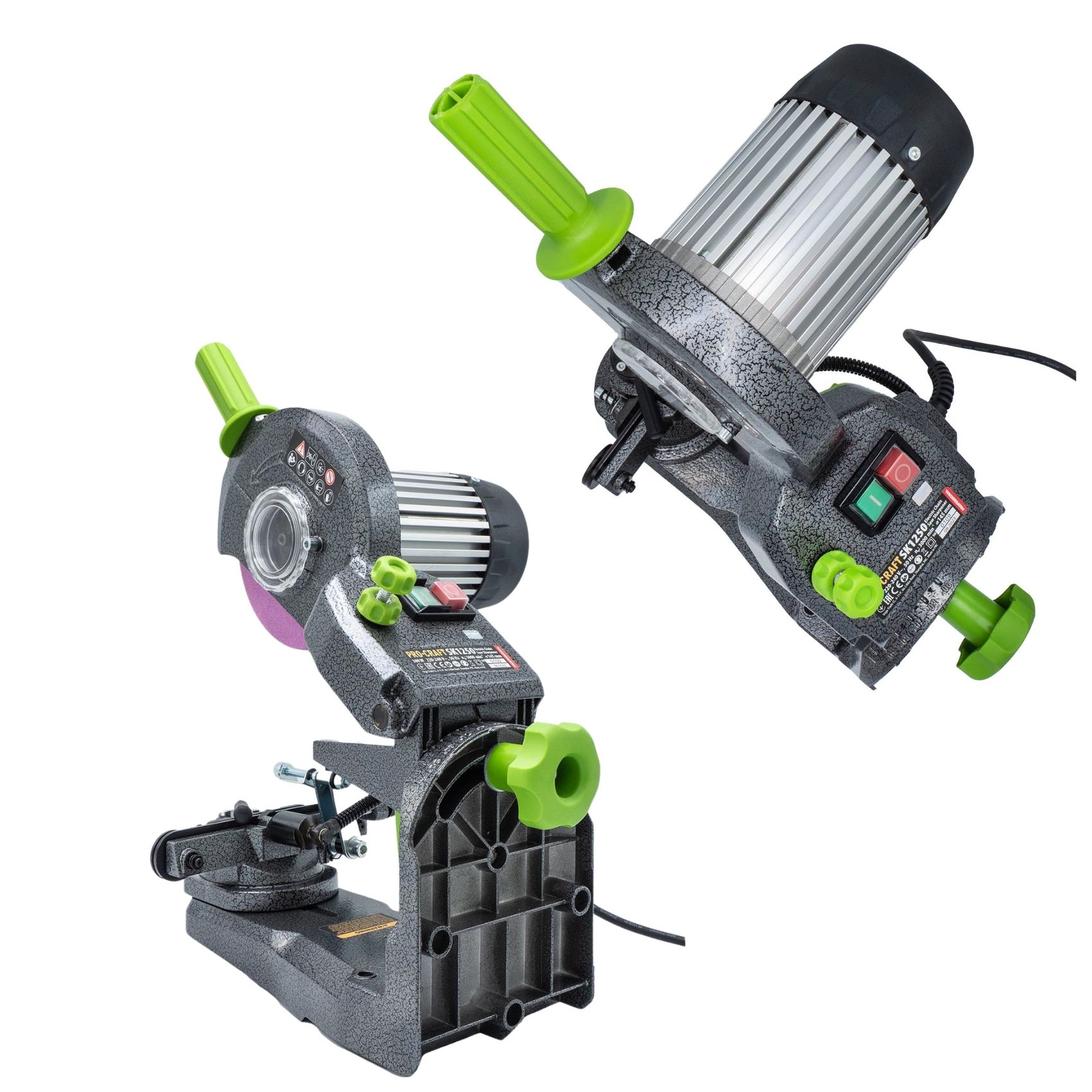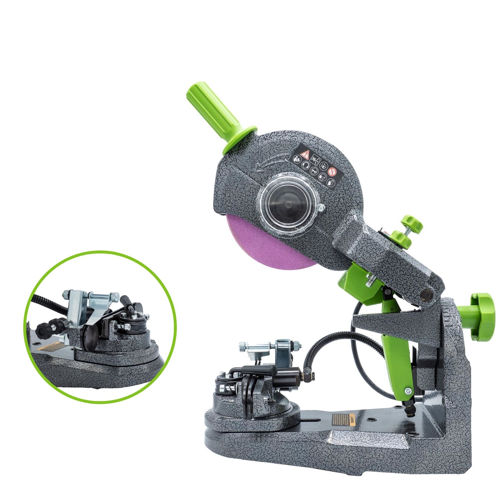 Модель має компактну конструкцію, зручну для встановлення на робочому столі, і важить лише 6,3 кг, що робить її зручною у використанні та транспортуванні. Для обробки використовуються шліфувальні кола діаметром 145 мм із посадковим діаметром 22 мм, що входять у комплект. Заточка підходить для роботи з металом і стане практичним рішенням для власників бензопил чи електропил.