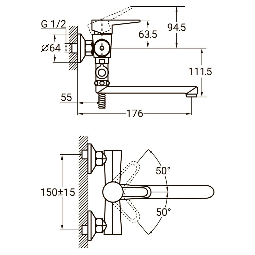 Компактний змішувач із коротким поворотним виливом 150 мм, призначений для стандартних ванн. Виносний картриджний дивертор забезпечує плавне та зручне перемикання потоку між виливом і душем.