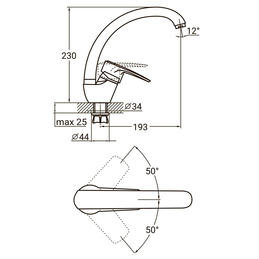 Кухонний змішувач з J-подібним поворотним виливом та зручним одноважільний керуванням. Оснащений керамічним картриджем діаметром 40 мм, що забезпечує плавне та довговічне регулювання напору та температури води. Корпус покритий хромонікелевим шаром, який захищає від корозії та зберігає блиск поверхні. Для стабільного потоку передбачено вбудований аератор. Монтаж виконується врізним способом із фіксацією на гайку, в комплект входять гнучкі підводи.