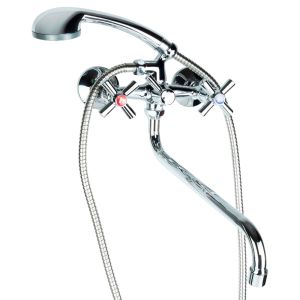 Двохвентильний змішувач для ванни з вигнутим виливом та вбудованим кульовим дивертором. Виріб має міцний корпус і надійний механізм перемикання потоку води між виливом і душем. Класичний дизайн підходить для більшості інтер’єрів ванної кімнати.