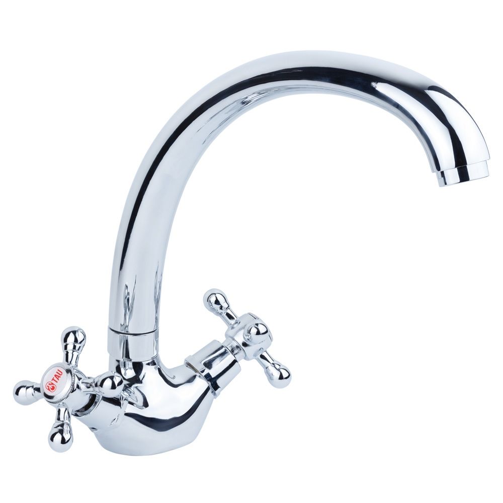 Двохвентильний змішувач для кухні з класичним J-подібним («вухо») поворотним виливом. Оснащений вбудованими вентилями з маркованими заглушками для холодної та гарячої води. Має хромонікелеве покриття, яке захищає поверхню від корозії та зберігає блиск протягом тривалого часу.