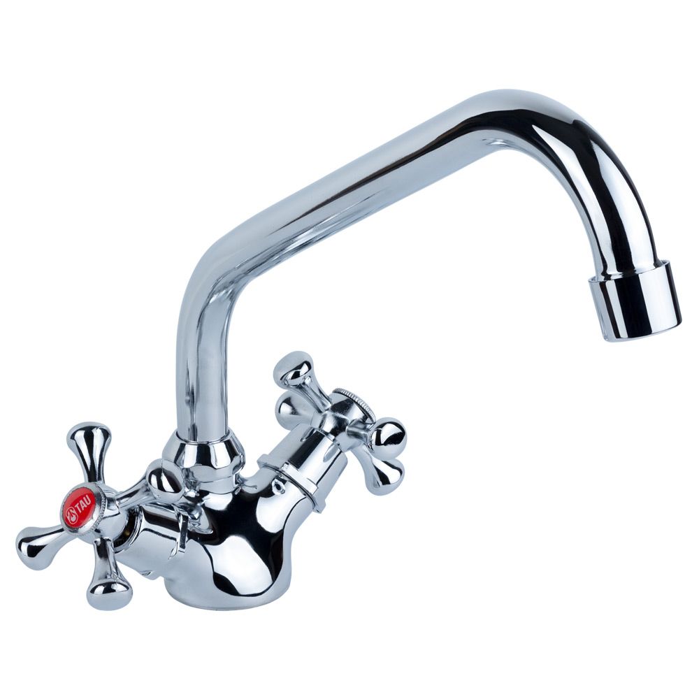 Змішувач для кухні TAU VN-4B160C — бюджетна двохвентильна модель у класичному стилі. Оснащений J-подібним гусаком, що обертається на 360°, та латунними кран-буксами з керамічними дисками для довговічності й плавного керування.